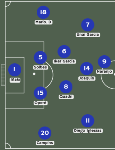 L’onze en que apostem per aquest diumenge és el següent: Iñaki a la porteria, per davant línia de 4 amb Campins jugant de lateral, parella de centrals formada per Operé i Solbes i al lateral esquerre Mario Domingo. Per davant Iker Garcia i Quadri formant doble pivot i a la mitja punta ve el dubte, on hem apostat per Joaquín Rodríguez en comptes d’Adri Gené o Fran Pérez. A la davantera Unai Garcia a l’esquerra, Diego Iglesias a la dreta i més avançat Guillem Naranjo.