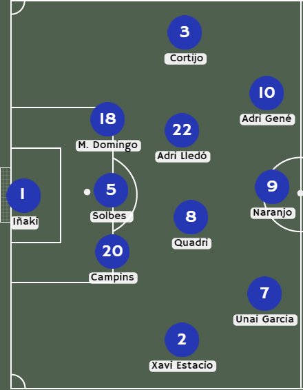 L’onze en què nosaltres apostem, no és ni més ni menys que el mateix que va posar Marc Garcia contra la UE Cornellà. Continuar amb la línia de 3 homes en defensa i amb Mario Domingo com a central esquerre, el doble pivot de Quadri i Lledó i els dos carrilers, Estacio i Cortijo. A la davantera amb 3 homes, bastant ofensiva, però va sortir molt bé en el partit passat i Unai Garcia repetint titularitat. Quant a dubtes, en pot tenir bastants el tècnic del Lleida contra el primer de la classificació. En primer lloc, si sortir amb un onze més defensiu o anar amb tot a l’atac. Si continuar amb Domingo com a central esquerre o posar al seu lloc Fuentes, o col·locar al lateral ex Europa al lloc de Cortijo per fer-ho més defensiu, o més defensiu encara posant a Óscar Rubio de carriler dret. I l’últim dubte és si jugar amb dos o 3 migcampistes, si amb Juanan a la mitjapunta o amb els 3 davanters i que Adri Gené ocupi les dues posicions.