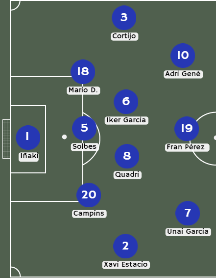 Quant a l’onze per afrontar aquest partit introduïm fins a 4 canvis respecte a l’alineació contra l’Alzira. En primer lloc, Iñaki sota pals, per davant tornem a posar la defensa de 3 en comptes de jugar amb 4 al darrere. Serien Campins, Solbes i Mario Domingo. Als carrilers dos dels que no van poder jugar per molèsties, Cortijo i Estacio. Tot seguit al mig del camp serà aquest cop Iker Garcia en el lloc d’Adri Lledó per acompanyar a Quadri. A la davantera Unai, Adri Gené i el gran canvi que fem és Naranjo per l’entrada de Fran Pérez.