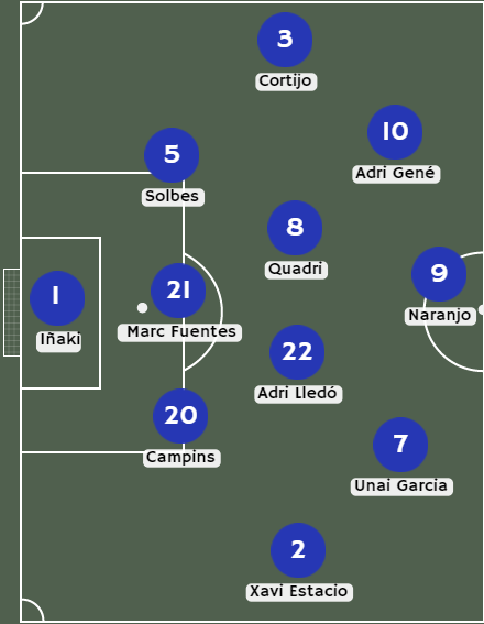L’alineació que formem contra el Cornellà és la següent: Per començar, a la porteria Iñaki Álvarez, seguit de la línia de 3 centrals que ja estem acostumats a veure, Campins, Fuentes i Solbes. Al carriler dret apostem un altre cop per Estacio per la bona primera meitat que va fer contra el conjunt balear, amb bones arribades pel costat dret. A l’esquerre, posem de suplent, per primer cop a la temporada, a Mario Domingo, i al seu lloc introduïm a Fer Cortijo, un Cortijo que va suposar un abans i un després en el partit passat , fent pràcticament com a extrem esquerre, amb arribades molt perilloses i bones centrades i passes filtrats. Al mig del camp continuen Quadri, i al seu costat Lledó i no posem a Juanan, titular al passat partit. Al seu lloc col·loquem a Unai Garcia en una de les bandes i així es forma un equip més ofensiu. Al capdavant l’acompanyaran Guillem Naranjo i Adri Gené, que tant pot estar com a davanter centre, mitjapunta o en una de les dues bandes.
