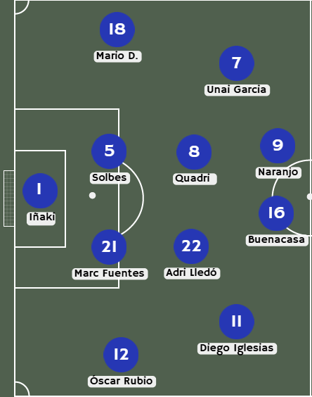 L’onze que plantegem per aquest partit és el següent: Iñaki sota pals per davant Óscar Rubio a la dreta, Marc Fuentes torna de sanció substituint Operé i també Solbes i Mario Domingo per completar la defensa. Fem un canvi de sistema, que és quasi el mateix però amb doble punta, abans, però Quadri i Lledó formant un doble pivot, a les bandes Diego Iglesias i Unai Garcia i doble davanter, Guillem Naranjo i Sergio Buenacasa, que és la novetat que introduïm a l’onze.